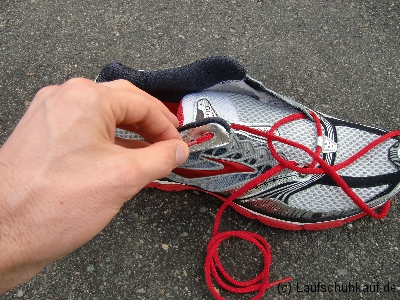 Die Festigkeit der Schnürung sollte so gewählt werden, dass sie nicht drückt! Der Laufschuh sollte fest aber v. a. bequem und angenehm sitzen. Insbesondere im Mittelfuß sollte sie einen sicheren Halt vermitteln. Der Fuß sollte v. a. an der Ferse nicht rutschen. Der Fersenhalt bspw. kann positiv durch die richtige Schnürung beeinflusst werden.